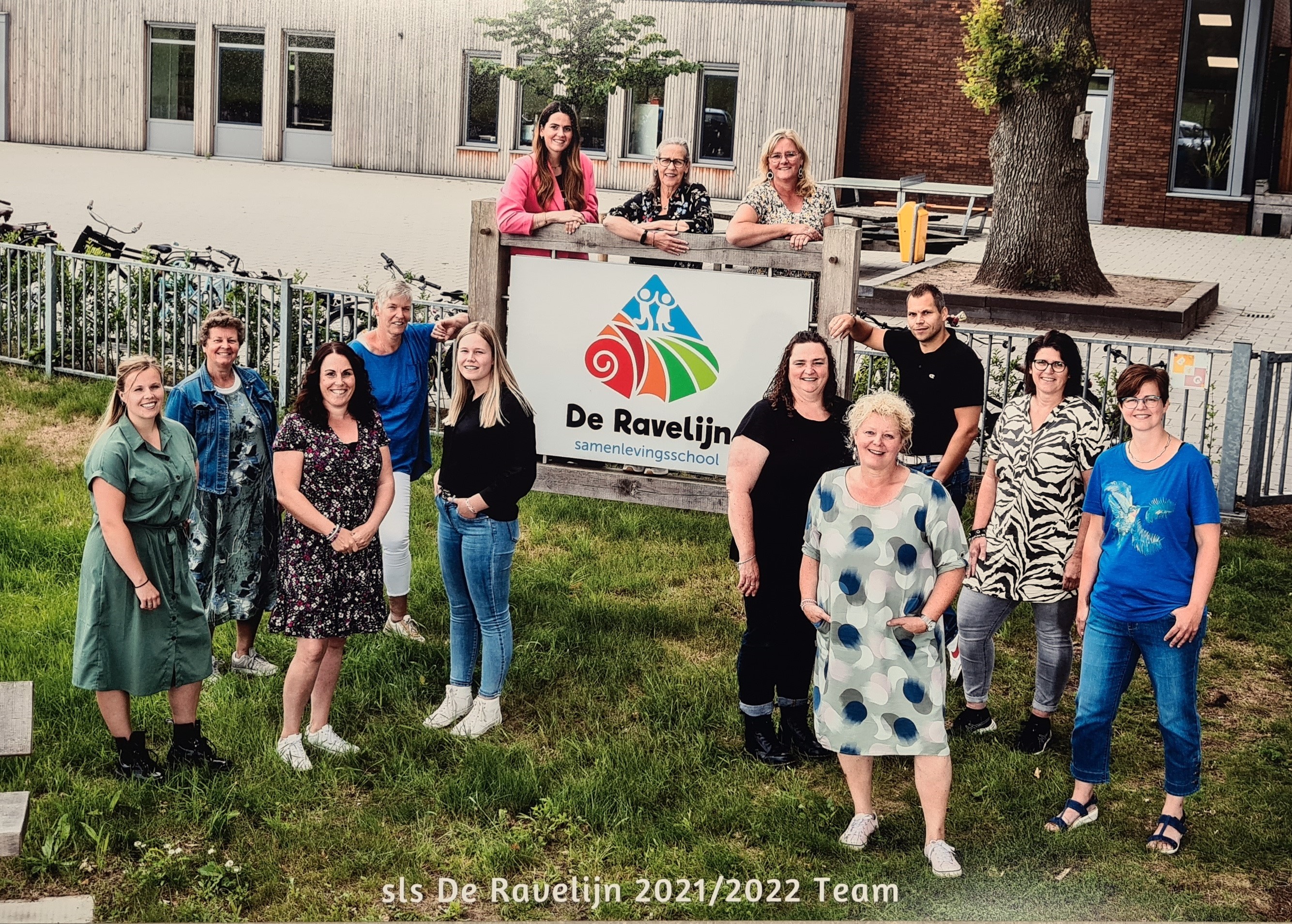 V.l.n.r. (links van logo:) juf Gerjanne (pedagogisch medewerker peutergroep en BSO), juf Nelleke; (onder logo:) juf Kylie, juf Alienke, juf Harmke, juf Leonie (stagiaire + LIO);